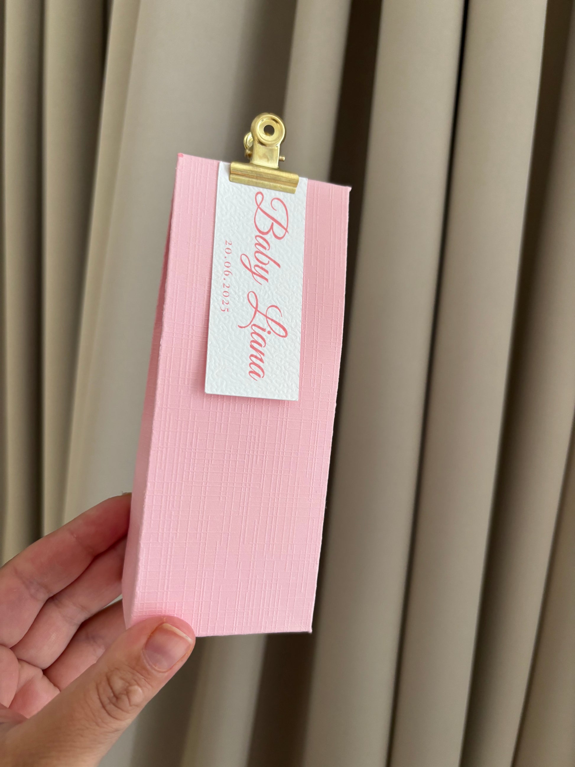 Een elegant en stijlvol hoog doosje, perfect om je babyshower nét dat beetje extra te geven. Gepersonaliseerd met naam en datum en afgewerkt met een mooie gouden clip. Ideaal om te vullen met chocolade, snoepjes of een klein bedankje voor je gasten.