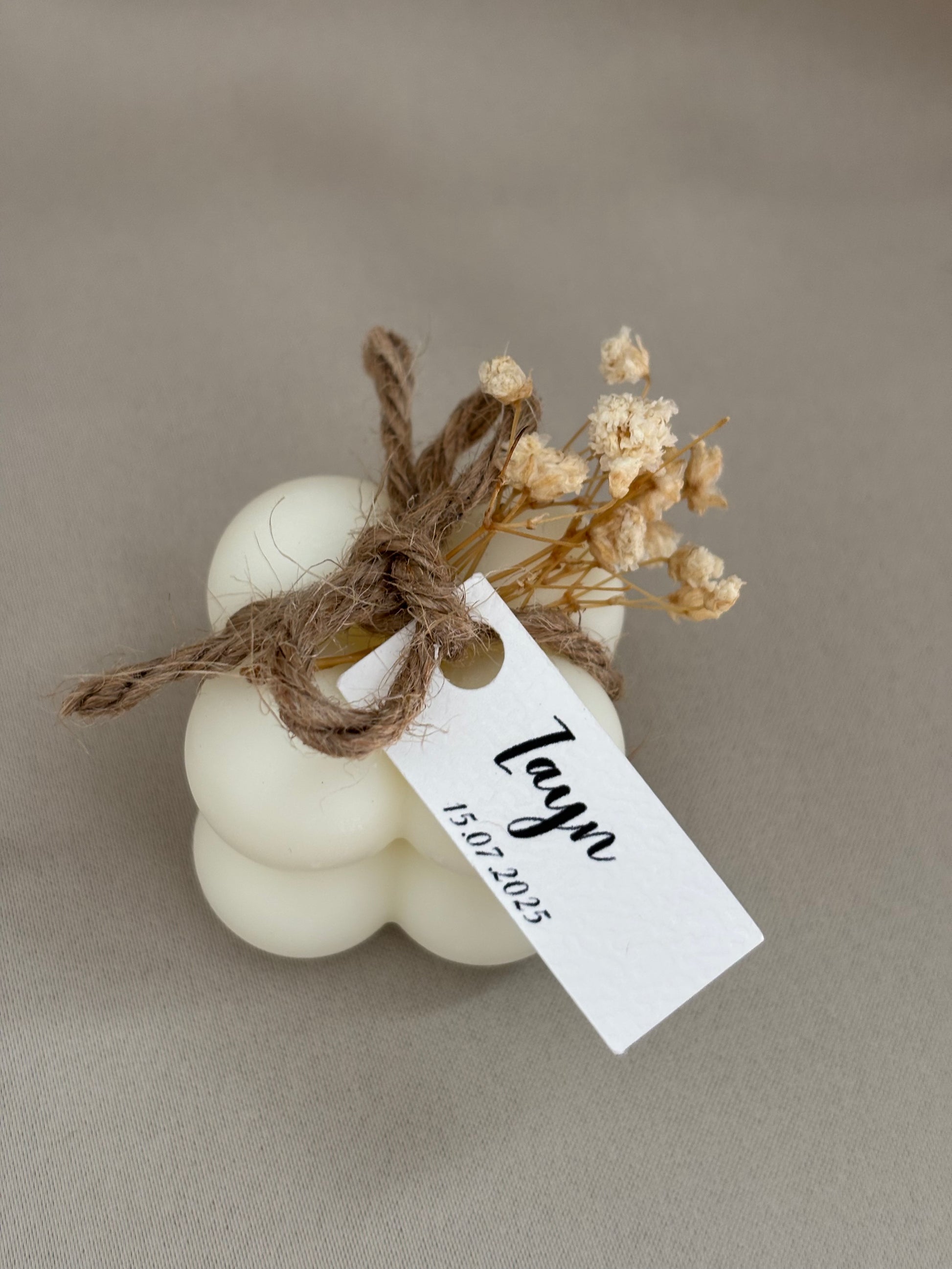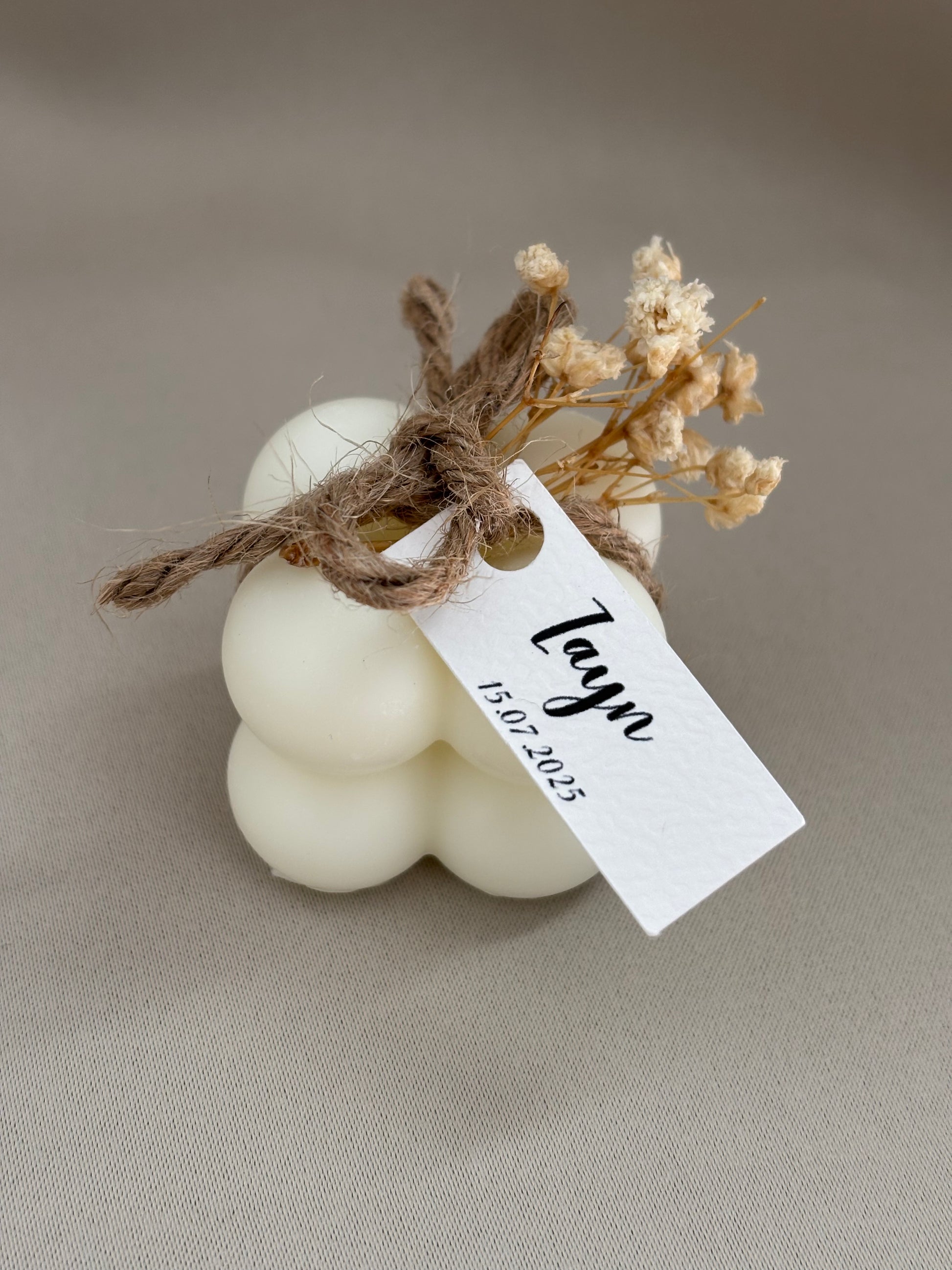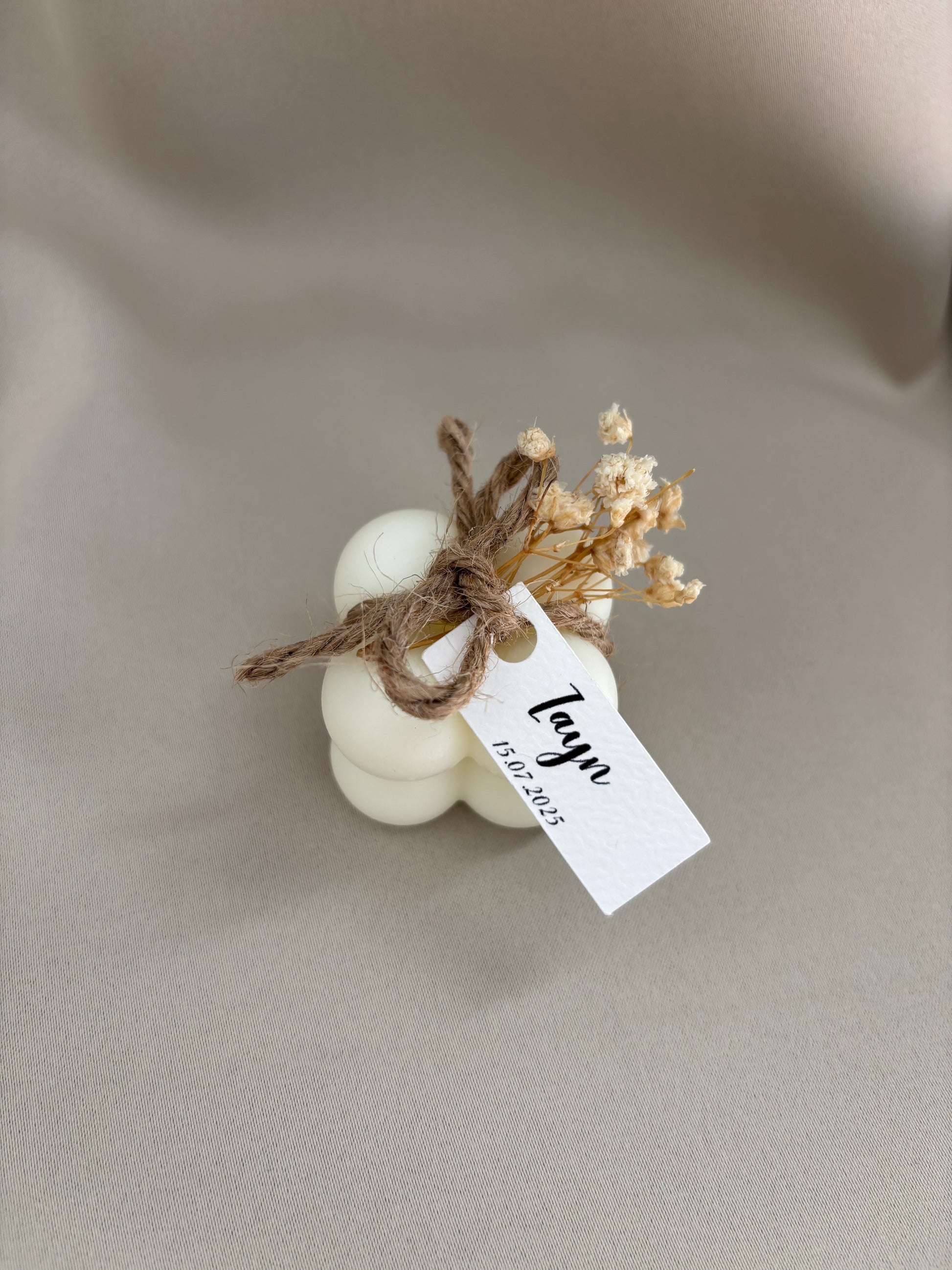 Met bubble kaars, afgewerkt met een strik, droogbloemen en gepersonaliseerd naamkaartje.