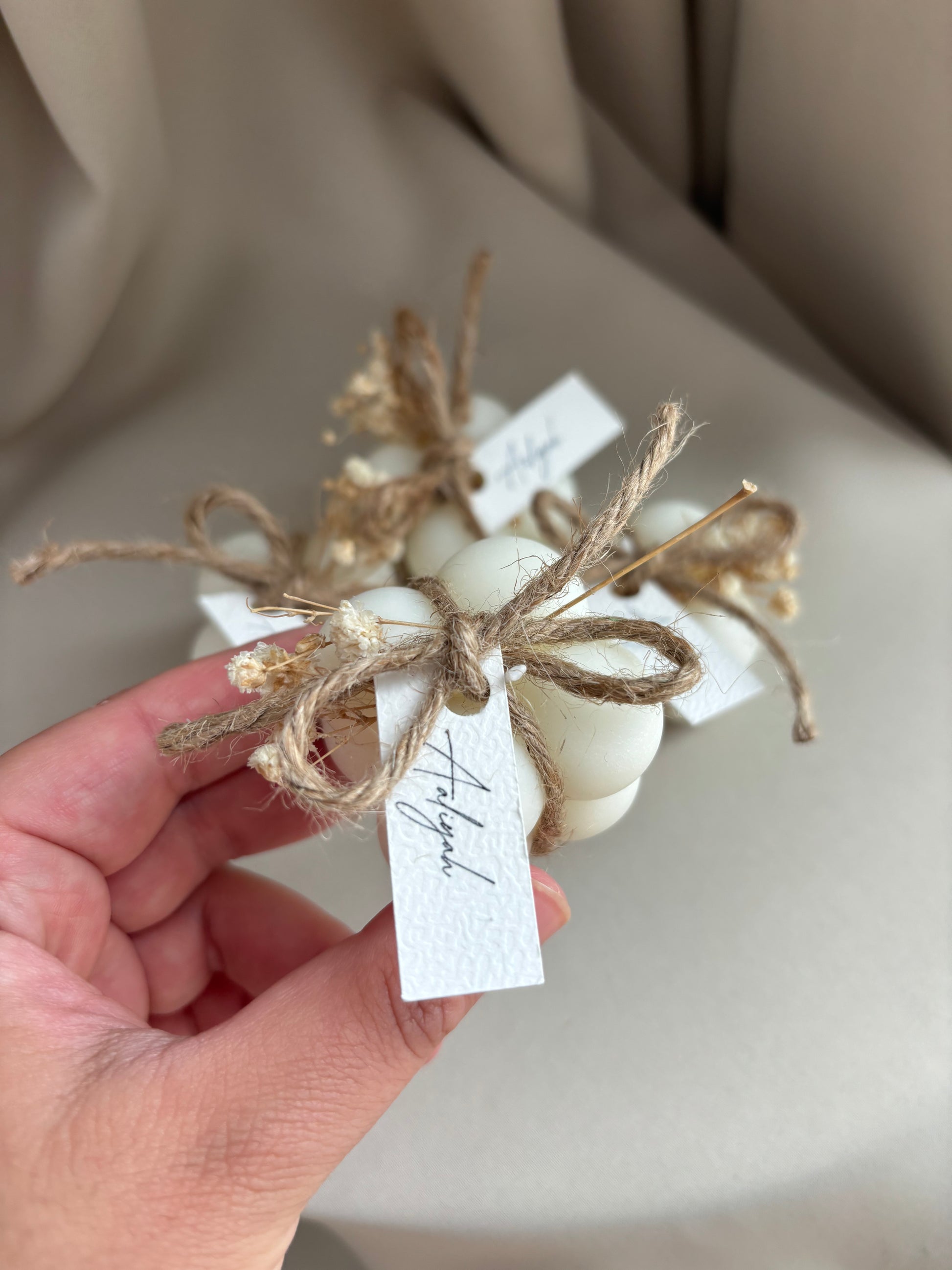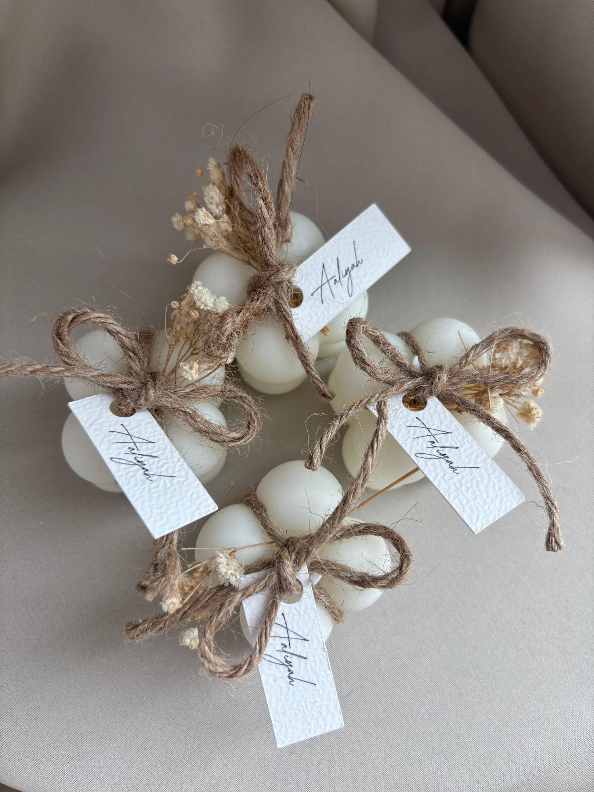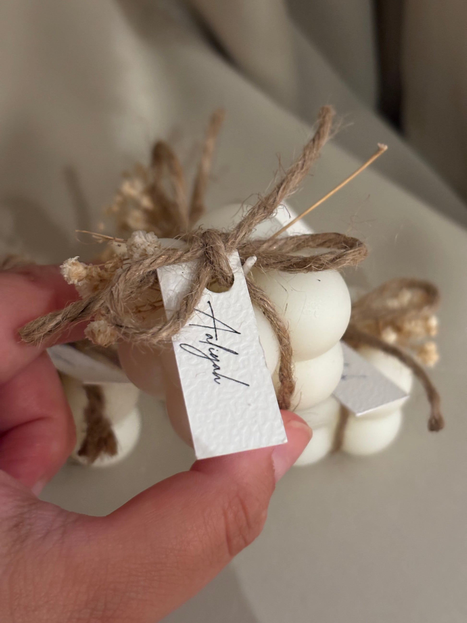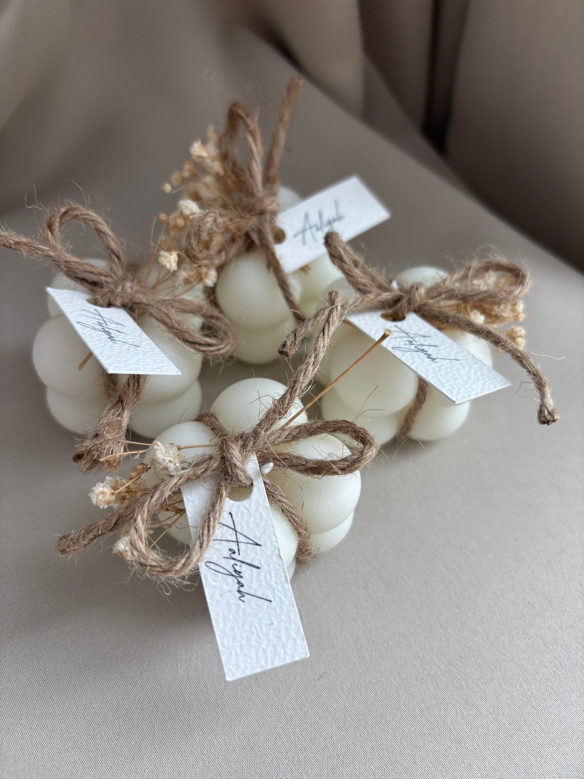 Met bubble kaars, afgewerkt met een strik, droogbloemen en gepersonaliseerd naamkaartje.