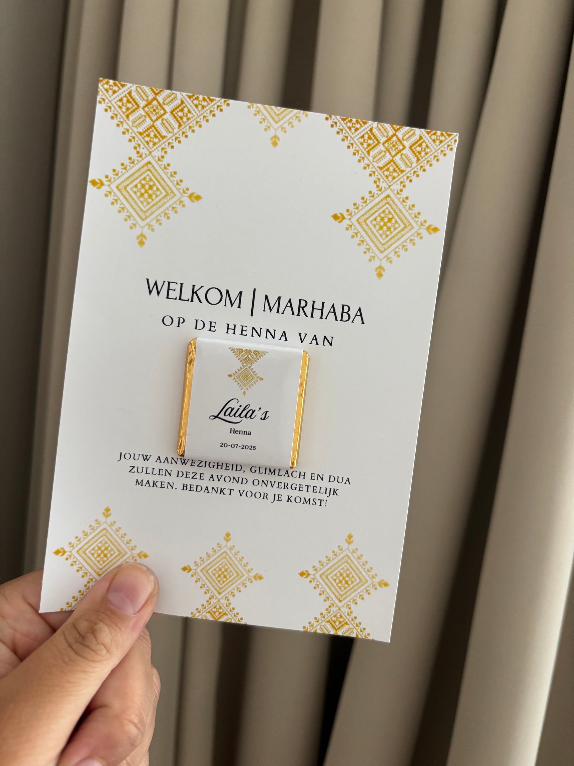Voeg een warm welkom toe aan jouw hennafeest met deze stijlvolle tafelkaart met mini chocolade geschikt voor zowel mannen als vrouwen.
