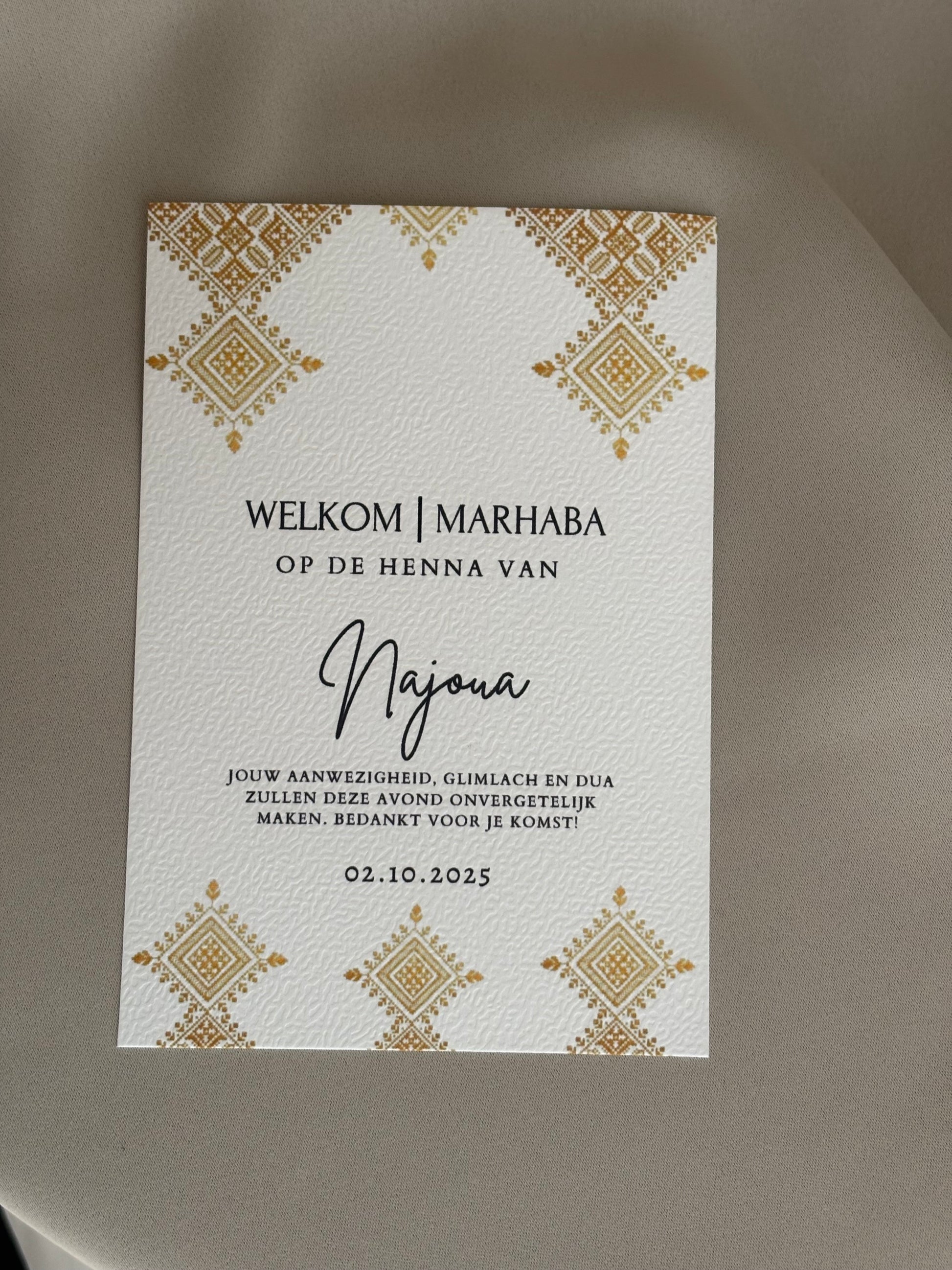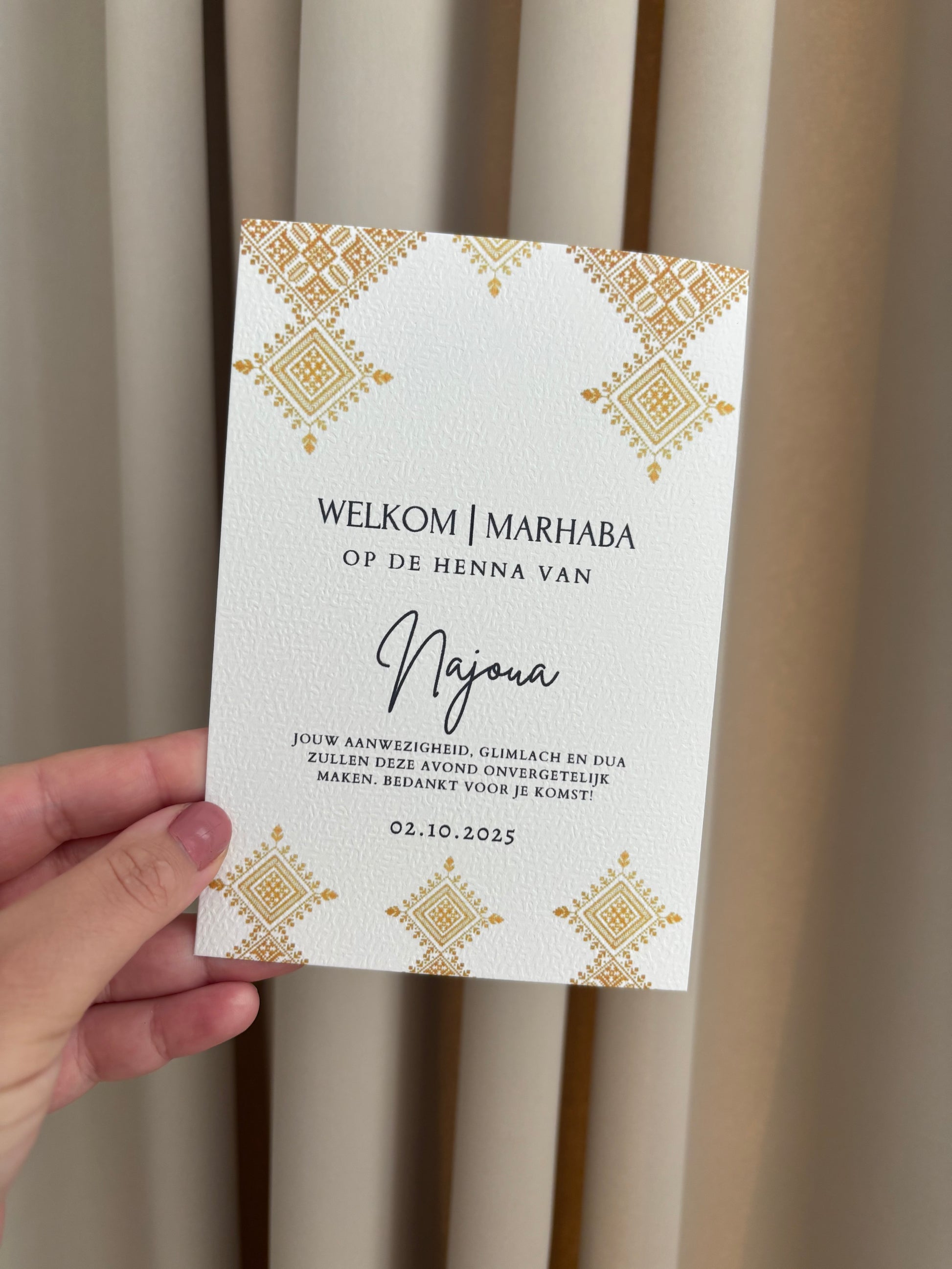 Met een elegante Marokkaanse uitstraling en persoonlijke touch is deze kaart perfect om gasten te verwelkomen en de sfeer compleet te maken.