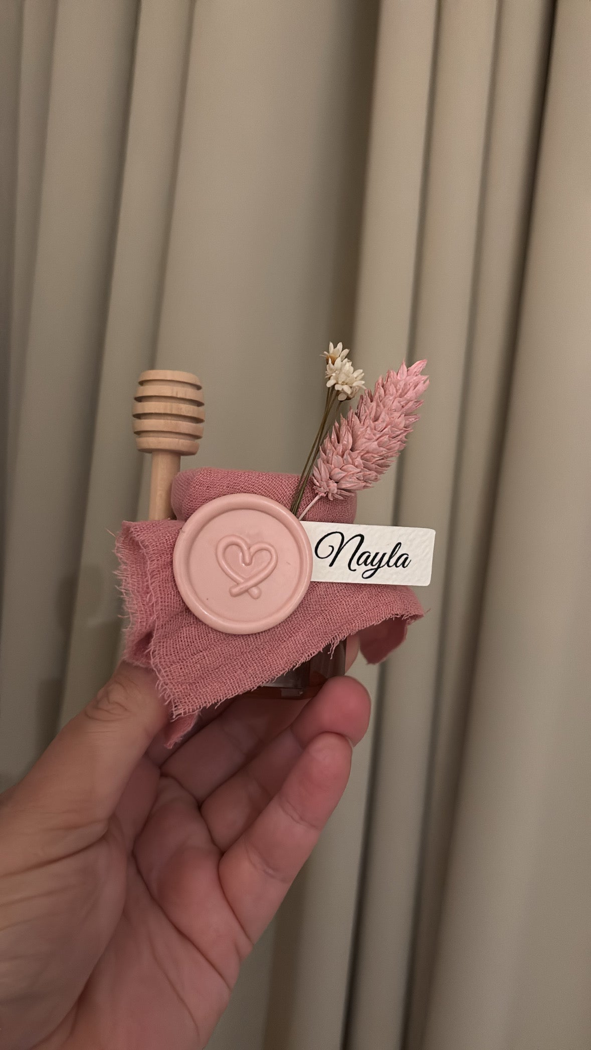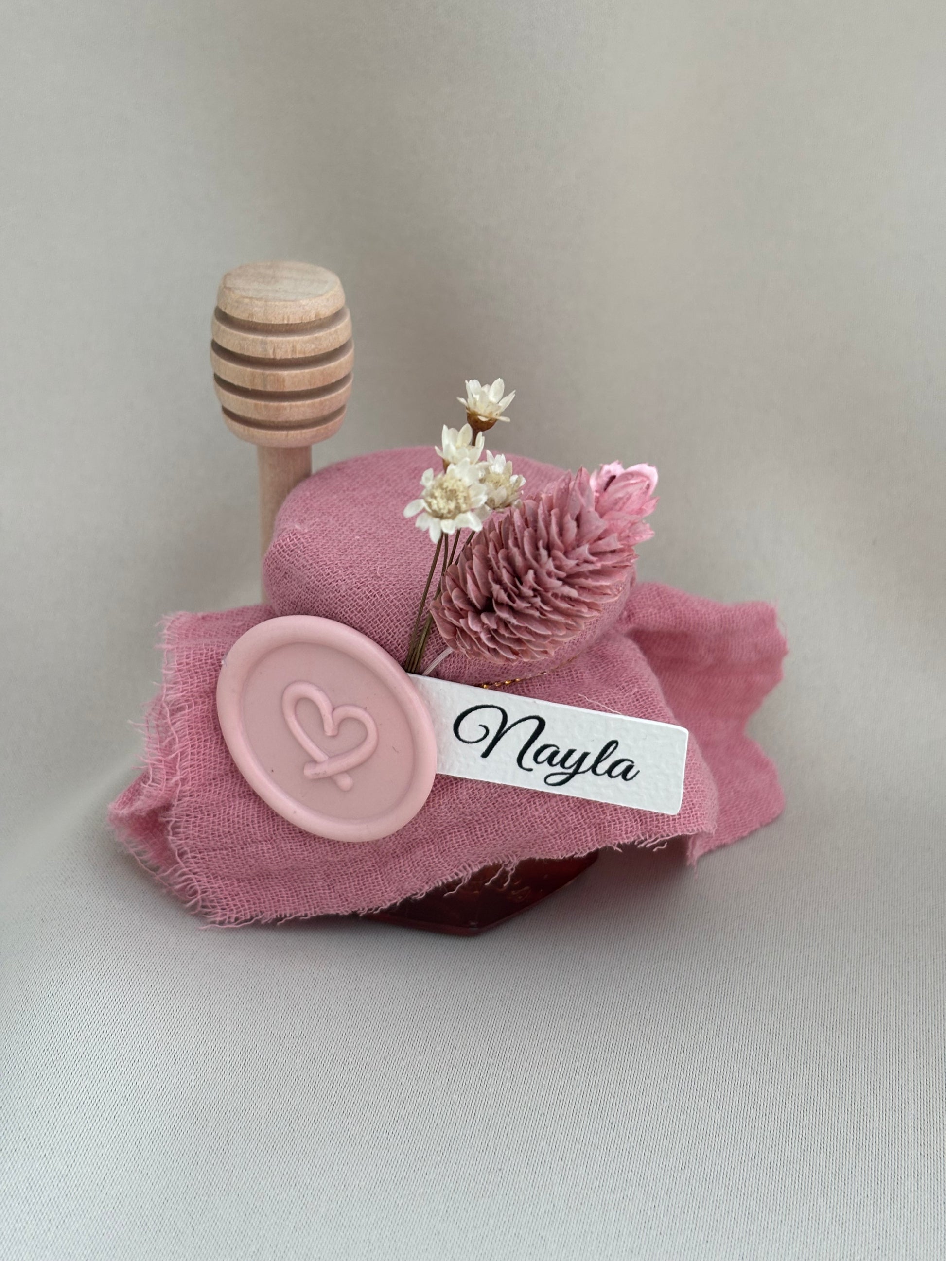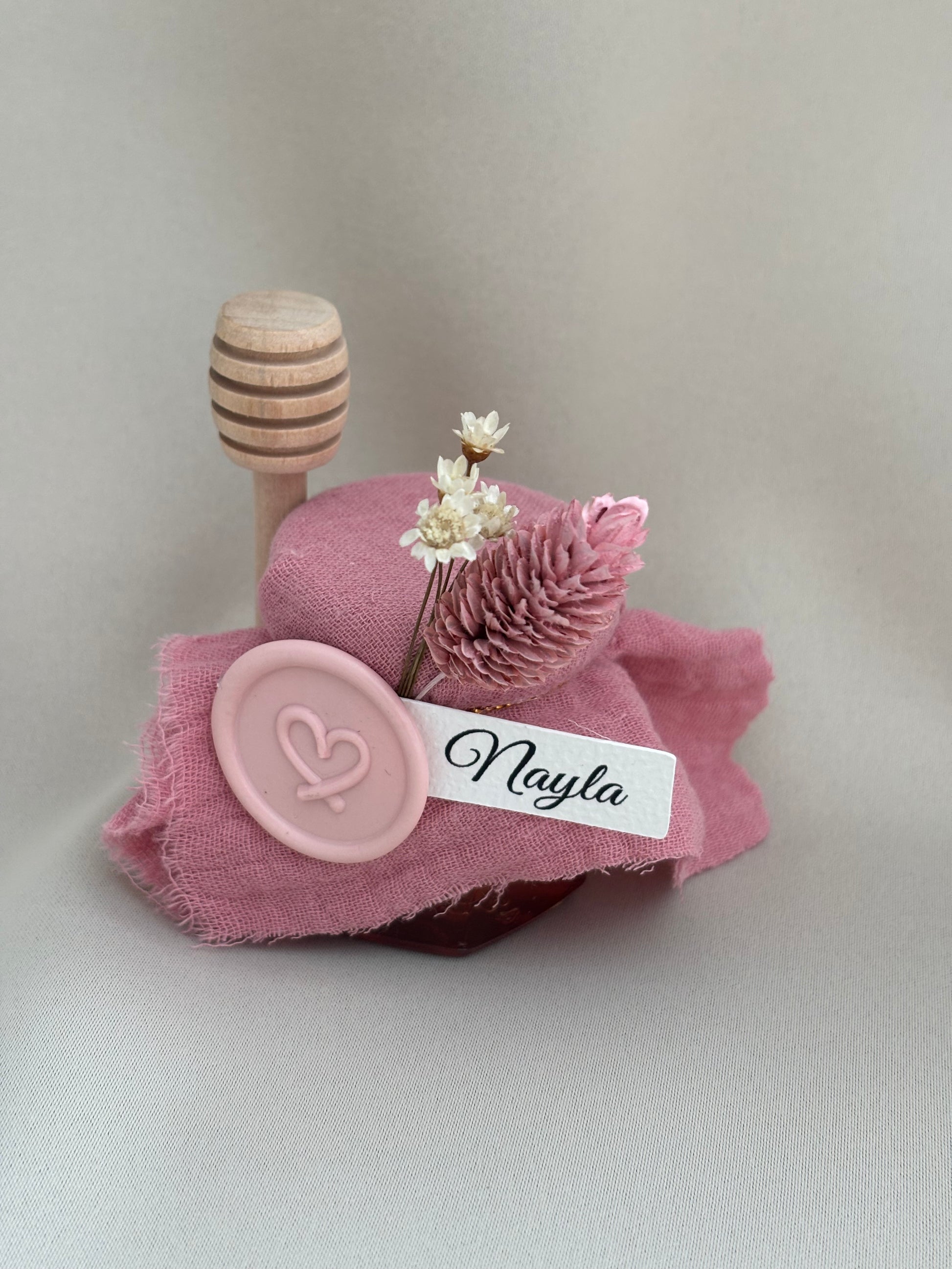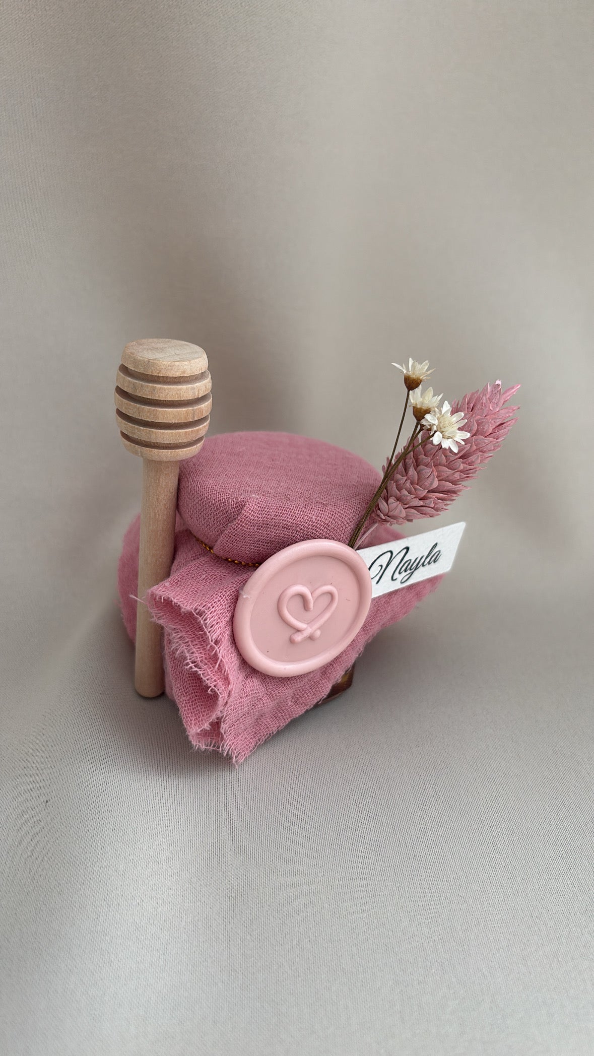 Een schattig glazen honingpotje, gevuld met honing en afgewerkt met een luxe roze mousseline doekje, houten honingdipper en droogbloemen. De elegante waxzegel en het gepersonaliseerde naamkaartje maken dit een perfect bedankje voor een geboorte, babyshower, bruiloft of andere speciale gelegenheid. Andere kleur achtergrond sticker is mogelijk neem hierover contact op.