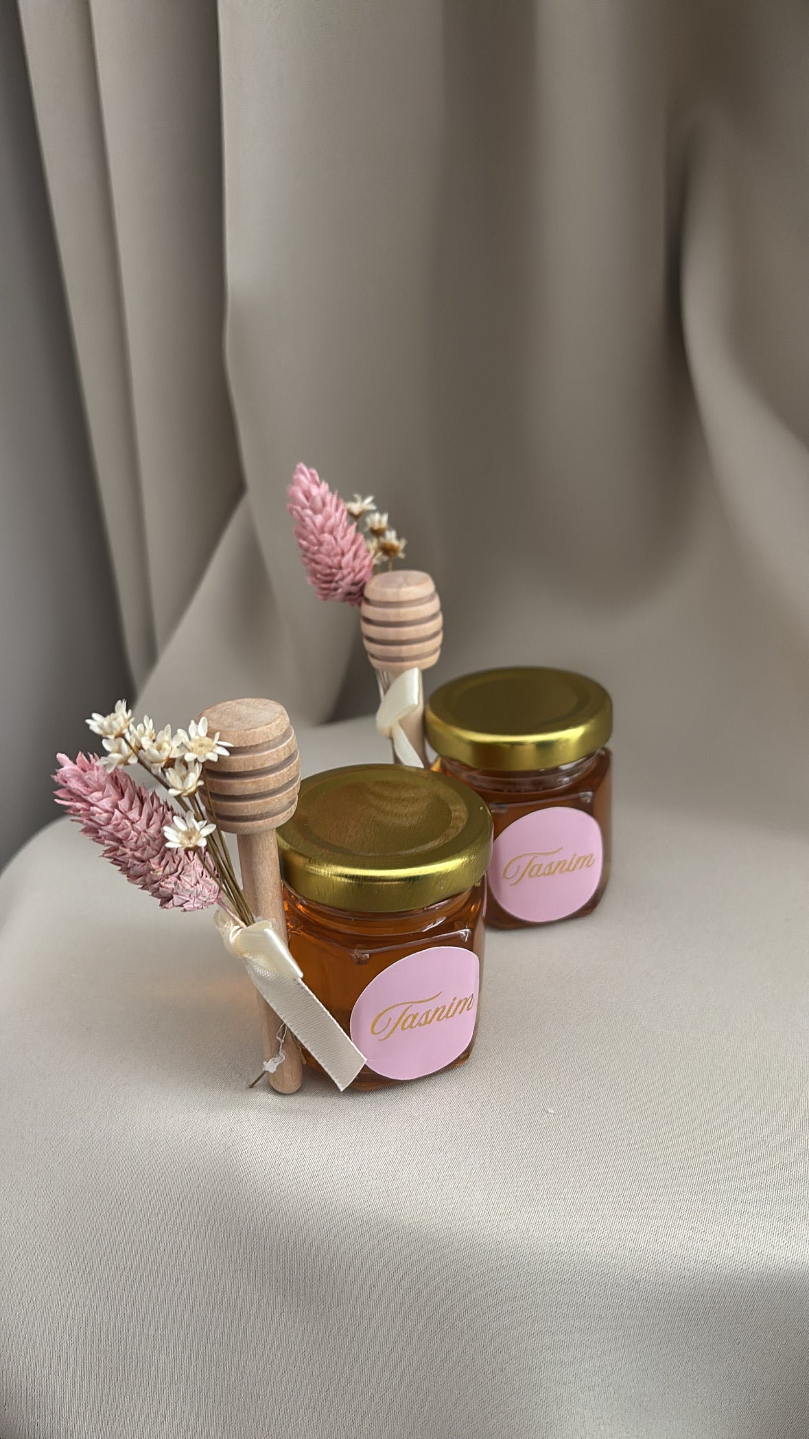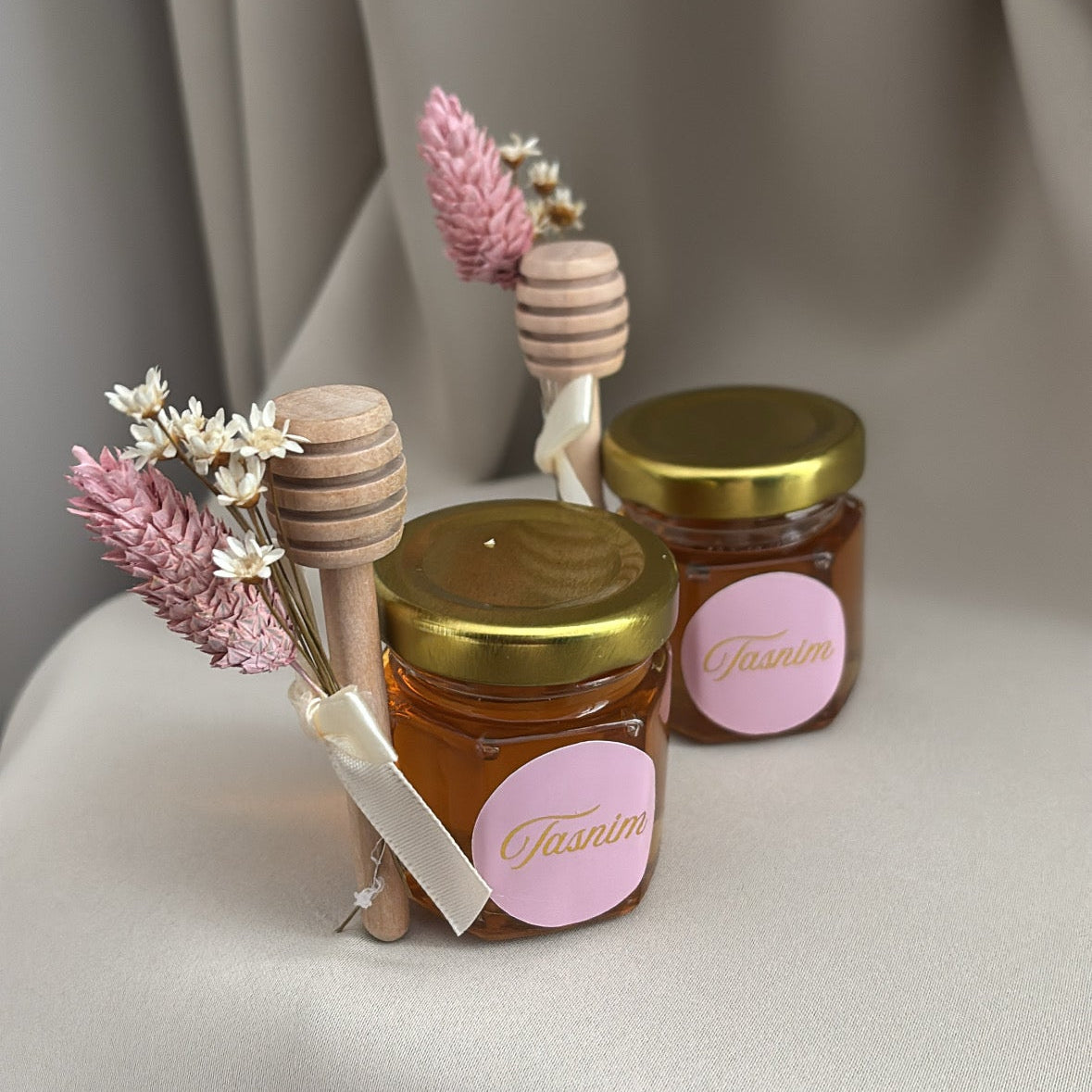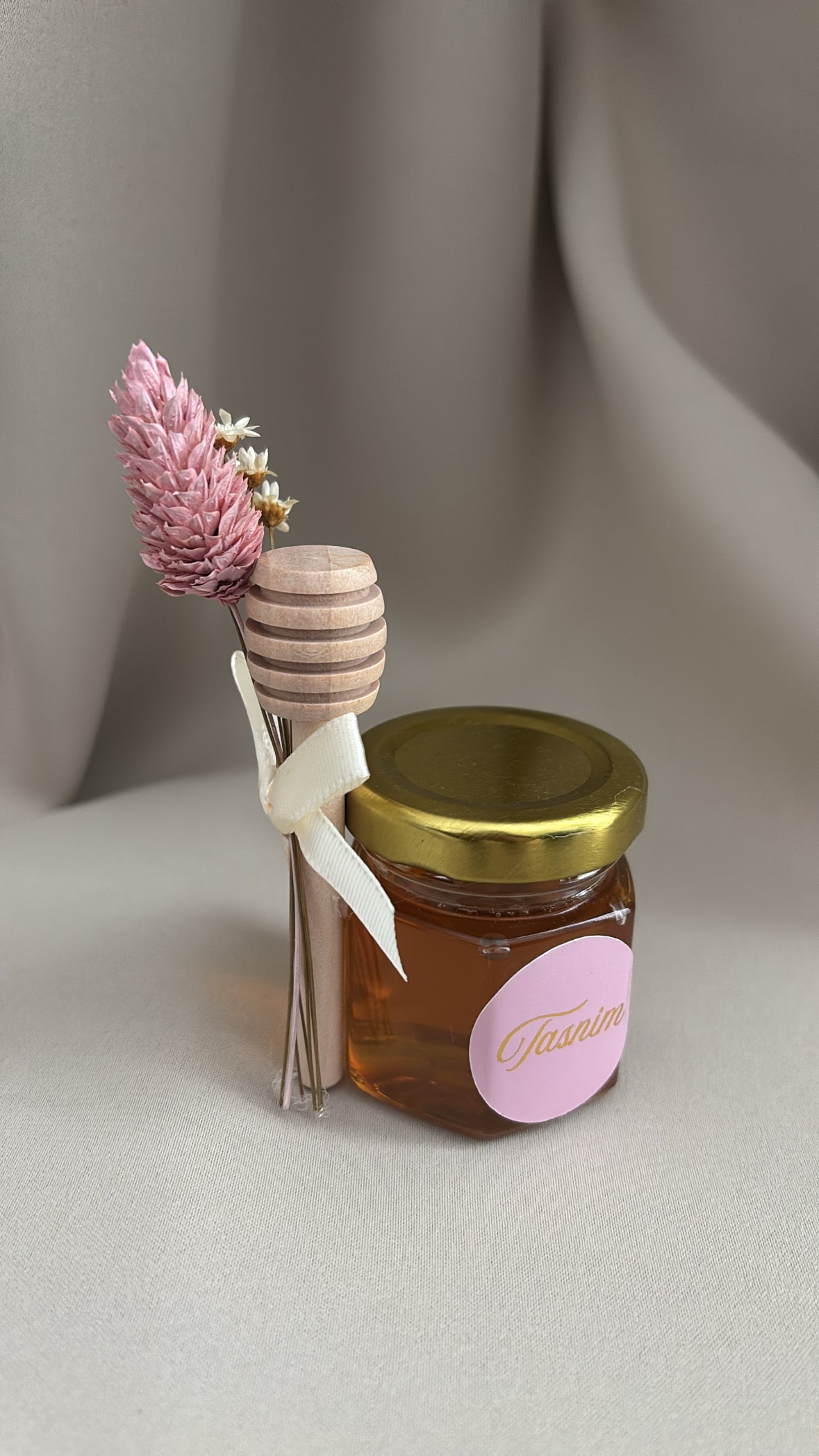 Een schattig glazen honingpotje, gevuld met honing en afgewerkt met een luxe roze mousseline doekje, houten honingdipper en droogbloemen. De elegante waxzegel en het gepersonaliseerde naamkaartje maken dit een perfect bedankje voor een geboorte, babyshower, bruiloft of andere speciale gelegenheid. Andere kleur achtergrond sticker is mogelijk neem hierover contact op.