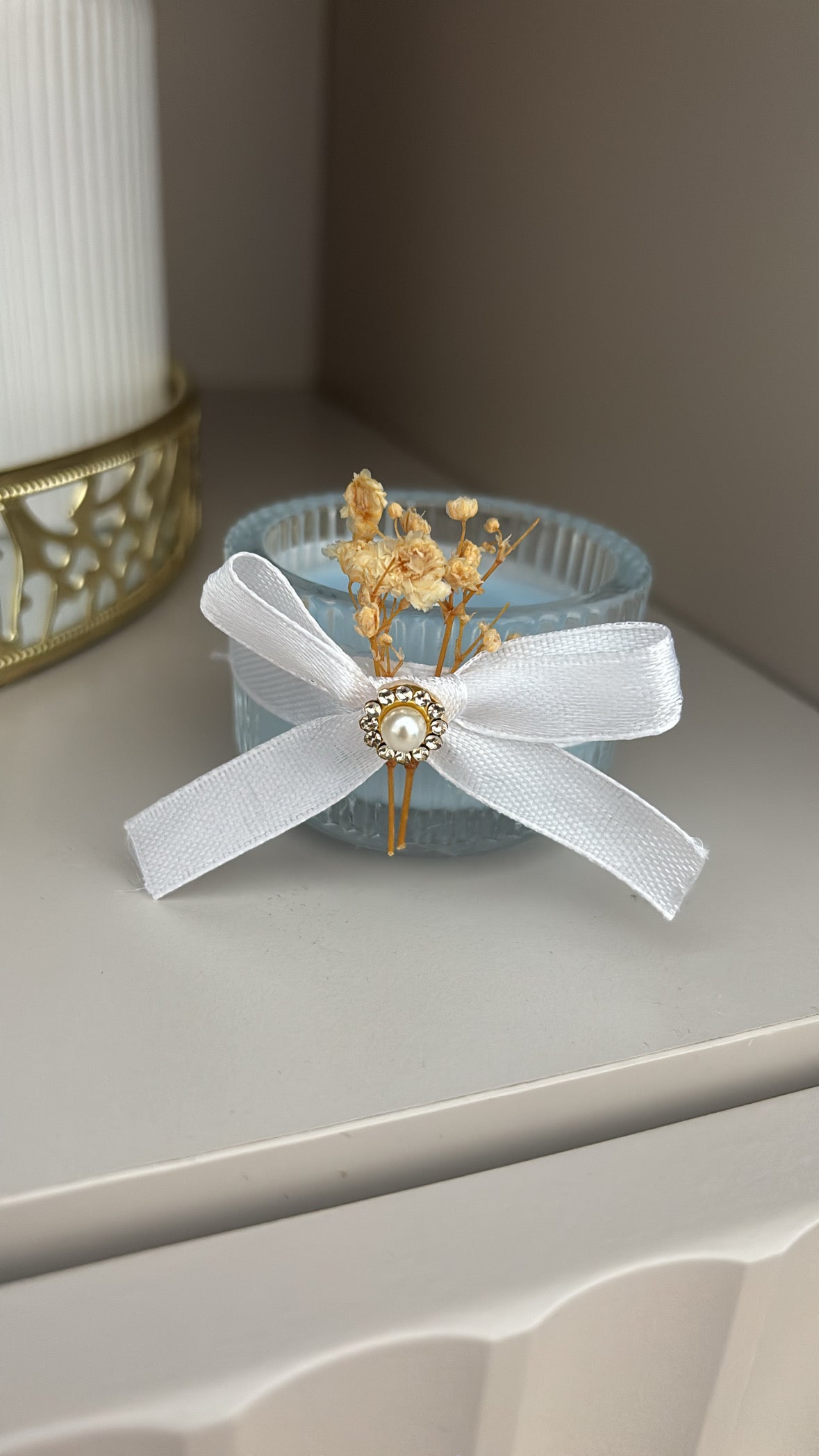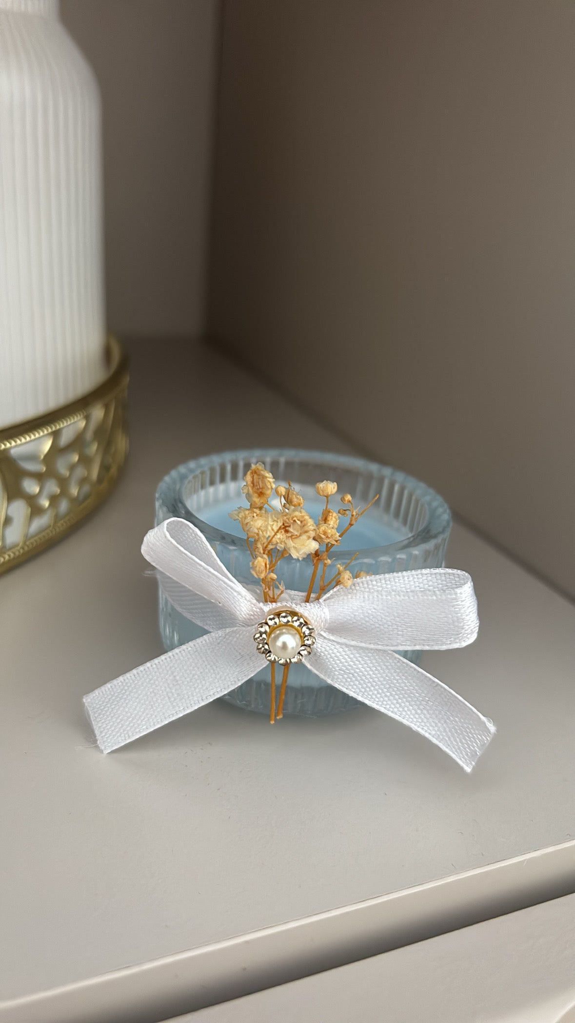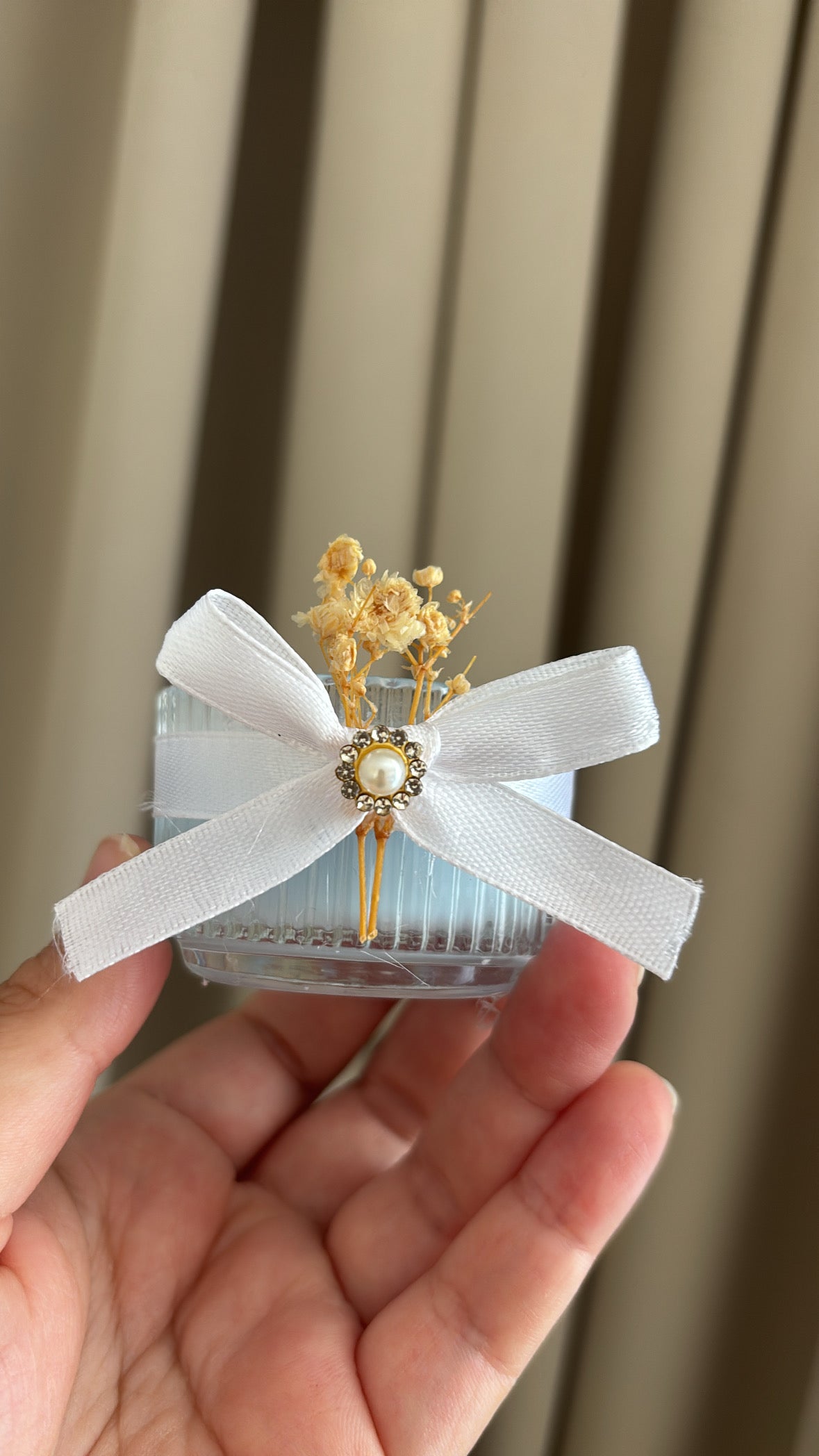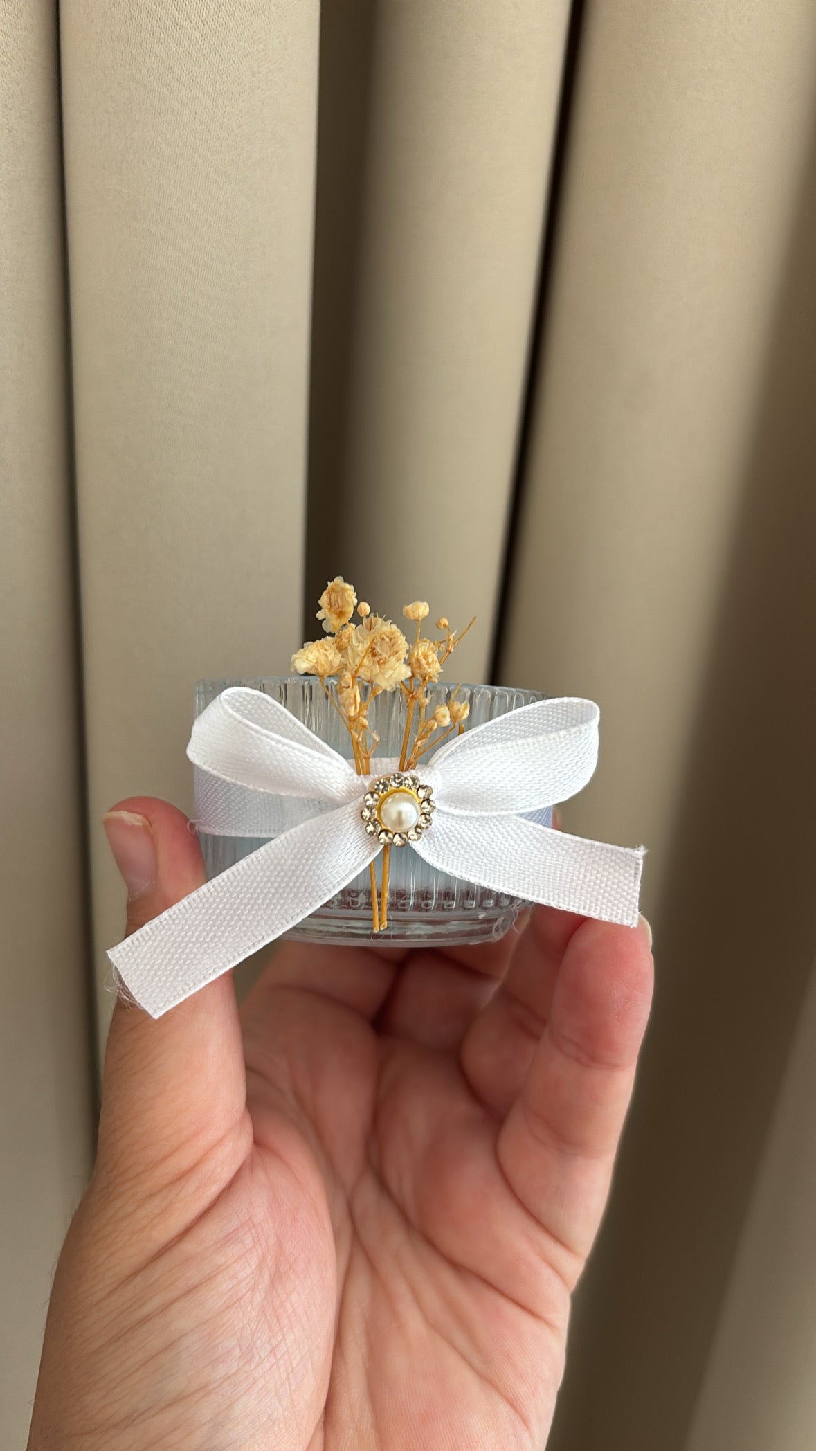 Een verfijnd en stijlvol bedankje dat direct charme uitstraalt. Dit glazen potje is prachtig afgewerkt met een wit lint, een pareldetail en subtiele droogbloemen. De kleur kaars kan aangepast worden naar u thema of gewenste kleur.