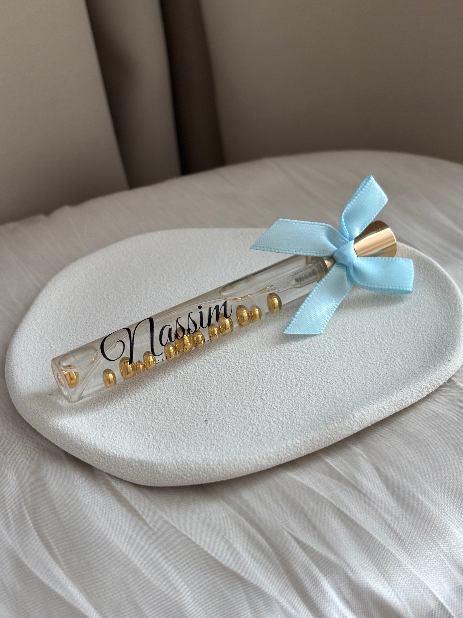 De flesjes zijn gevuld met parels en naam en datum (optie)