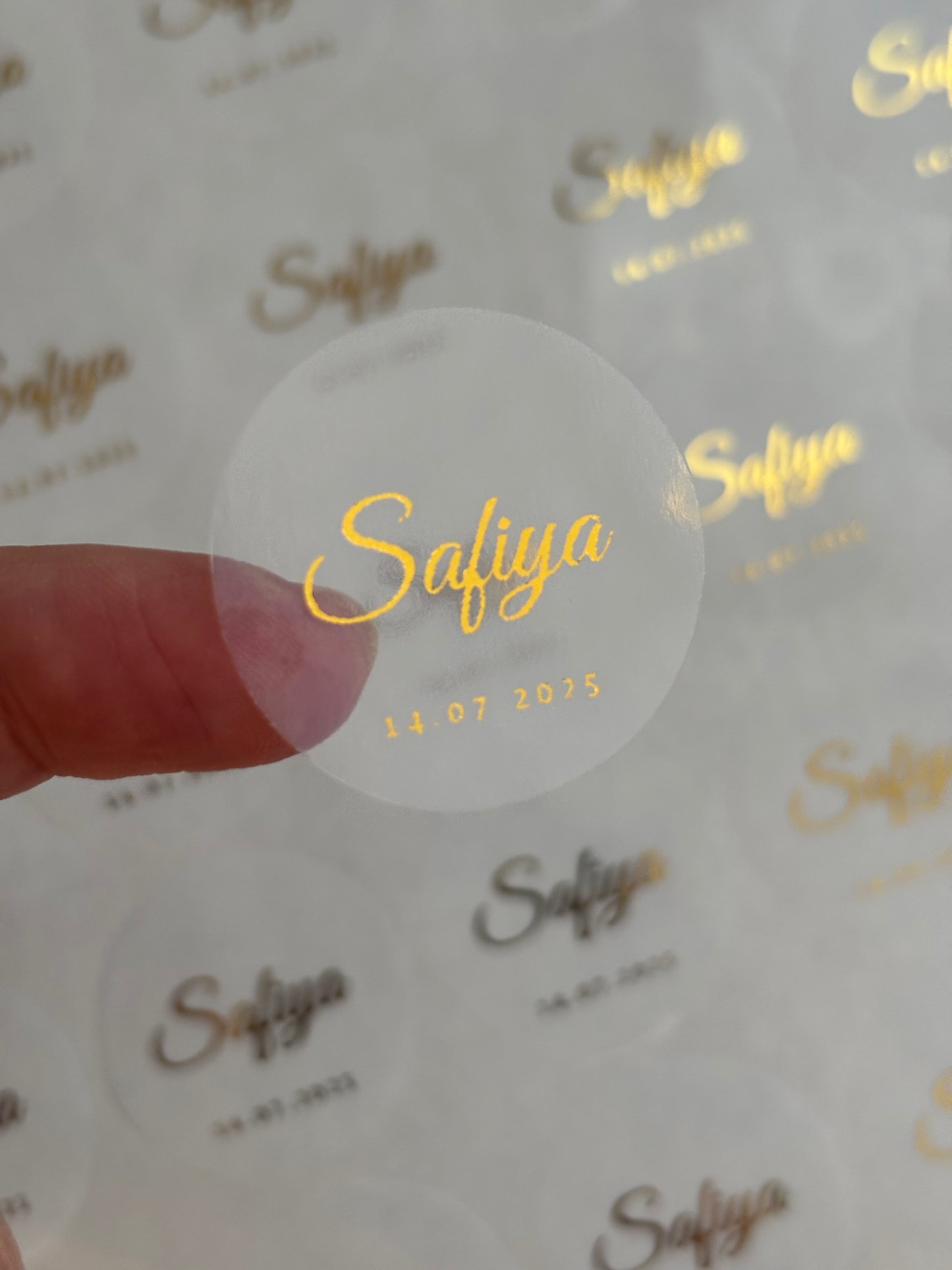 Geef jouw bedankjes of traktaties een elegante en luxe uitstraling met deze semi-transparante stickers. De glanzende folie in goud of zilver maakt het ontwerp helemaal af – perfect voor een geboorte, babyshower, bruiloft, verloving of tahara.