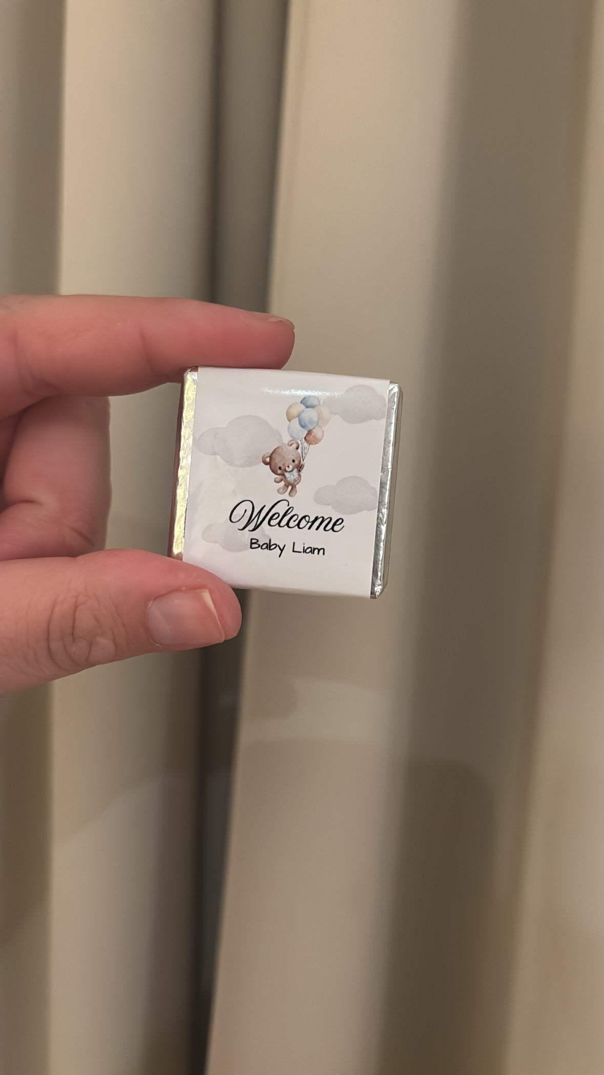 Vier de komst van een kleintje met deze schattige mini chocolaatjes. De wikkel is voorzien van een lieve illustratie met beertje en ballonnen, gepersonaliseerd met naam — een perfect detail om een geboorte extra bijzonder te maken.